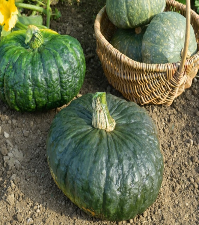 Derlius imamas po 125 dienų nuo daigų pasodinimo. Vaisiai – kriaušės formos, žalia dryžuota žievele, sveria apie 10 kilogramų. Minkštimas oranžinės spalvos, saldus, turi riešutų prieskonį.